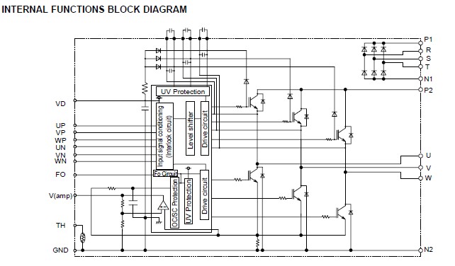 PS12034 features: (1)Converter bridge for 3 phase AC-to-DC power conversion; (2)3 phase IGBT inverter bridge configured by the latest 3rd. generation IGBT and diode technology; (3)Inverter output current capability IO.